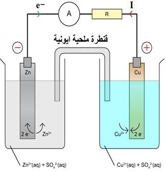 ) مرتبطين كهربائيا بواسطة قنطرة ملحية ( أيونية ) يحتوي كل نصف عمود على مؤكسد و مختزل مزدوجة. 3. مبدأ اشتغاله