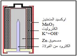 - نفس مكونات العمود الملحي تقريبا غير ان الإلكترودان مغموران في محلول قاعدي مخَتَّر لهيدروكسيد البوتاسيوم (K++OH- ) ، و تسمى قلائية بسبب عنصر البوتاسيوم.
