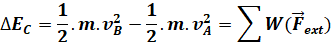 Dans un repère galiléen, la variation d'énergie cinétique d'un corps solide indéformable en déplacement, entre deux moments, est égale à la somme algébrique du travail de toutes les forces extérieures appliquées sur le corps entre ces deux moments.