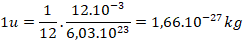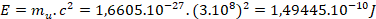 :E = m u . c 2 =1,6605.1 0 - 27 .(3.1 0 8 ) 2 =1,49445.1 0 - 10 J