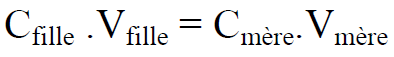 Lors d’une dilution, il y a conservation de la quantité de matière dissoute nfille=nmère , ce qui se traduit par la relation entre les concentrations Cfille , Cmère et les volumes Vmère, volume de solution-mère prélevé et Vfille volume de solution fille fabriquée ;