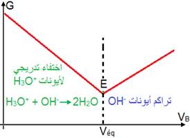 نتتبع تطور مواصلة جزء من محلول مائي لحمض الكلوريدريك, ذي تركيز مجهول CA بدلالة الحجم المضاف VB من محلول مائي للصودا, ذي تركيز CB معروف, فنحصل على المنحنى التالي: