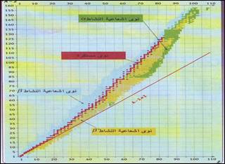 * La figure ci-contre est un graphique (N; Z), qui est un diagramme qui localise les noyaux stables et les noyaux rayonnants, où chaque noyau est représenté par un petit carré dont son Abscisse est Nombre Z de protons du noyau, Et son ordonnée est N le nombre de ses neutrons.