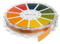 Papier spécial qui change de couleur après avoir été mouillé avec la solution, et nous comparons sa couleur avec l'échelle de couleurs de référence accompagnée des valeurs de pH correspondant à chaque couleur